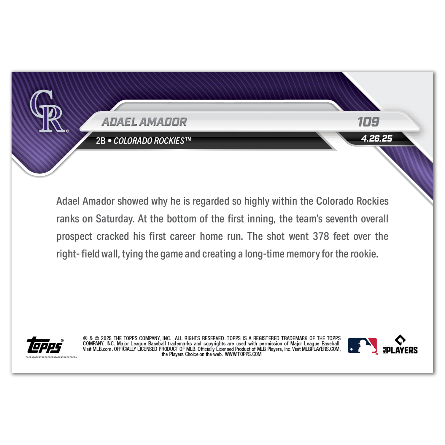 Adael Amador - 2025 MLB Topps NOW® - Card 109 - PR: 608