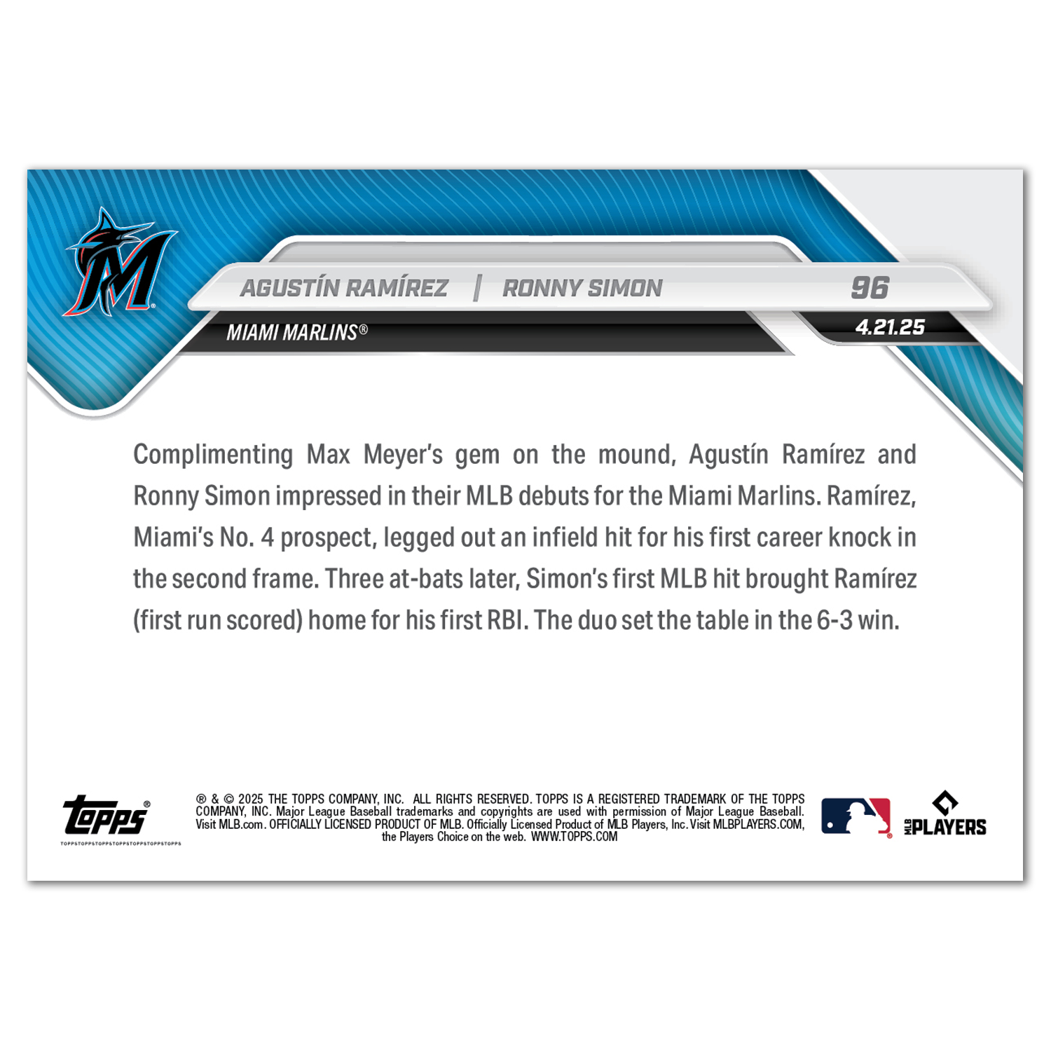 Agustín Ramírez/Ronny Simon - 2025 MLB Topps NOW® - Card 96 - PR: 571