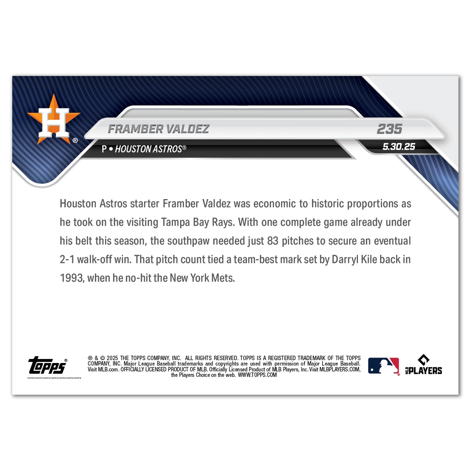 Framber Valdez - 2025 MLB Topps NOW® - Card 235 - PR: 477