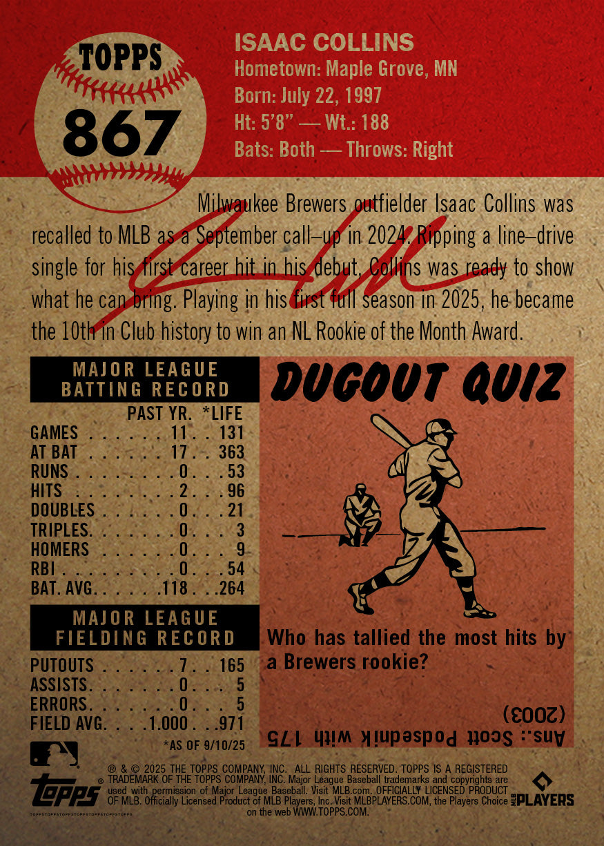 Isaac Collins - 2025 MLB Living Set® - Card 867 - PR: 1394