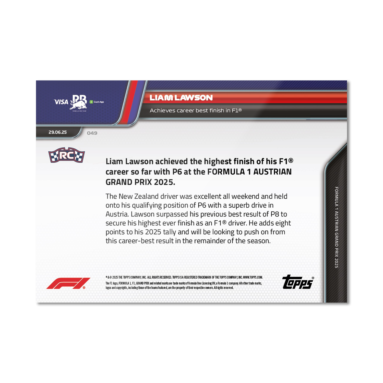 Liam Lawson - 2025 Formula 1® Topps NOW® - Card 49 - PR: 798