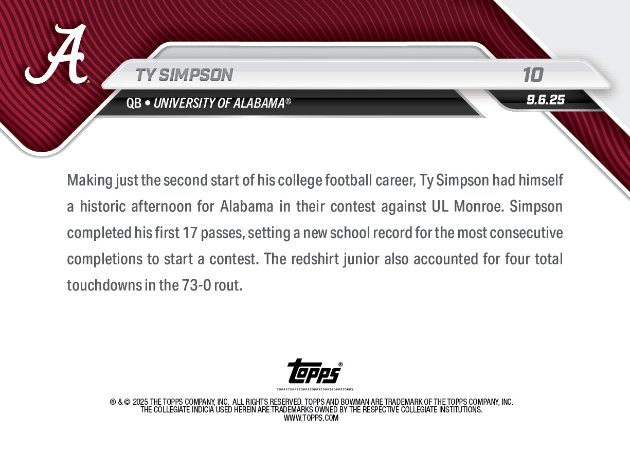 Ty Simpson - 2025-26 Bowman U NOW® Football - Card 10 - PR: 488